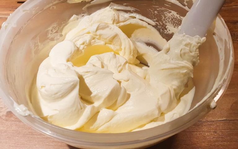 Wenn Du die gewünschte Konsistenz erreicht hast, dann schlage nicht weiter. Wenn Du zu lange die Creme aufschlägst, beginnt die Sahne sich zu teilen.