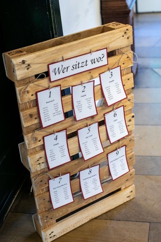 Wenn das Brautpaar zwar Tische zuordnen möchte, aber den genauen Sitzplatz nicht vorgibt, können die Gäste auch am Eingang ihre Namenschilder abholen, die auf der Rückseite mit der Tischnummer versehen sind. Am richtigen Tisch können sie sich anschließend selbstständig einen Platz suchen.